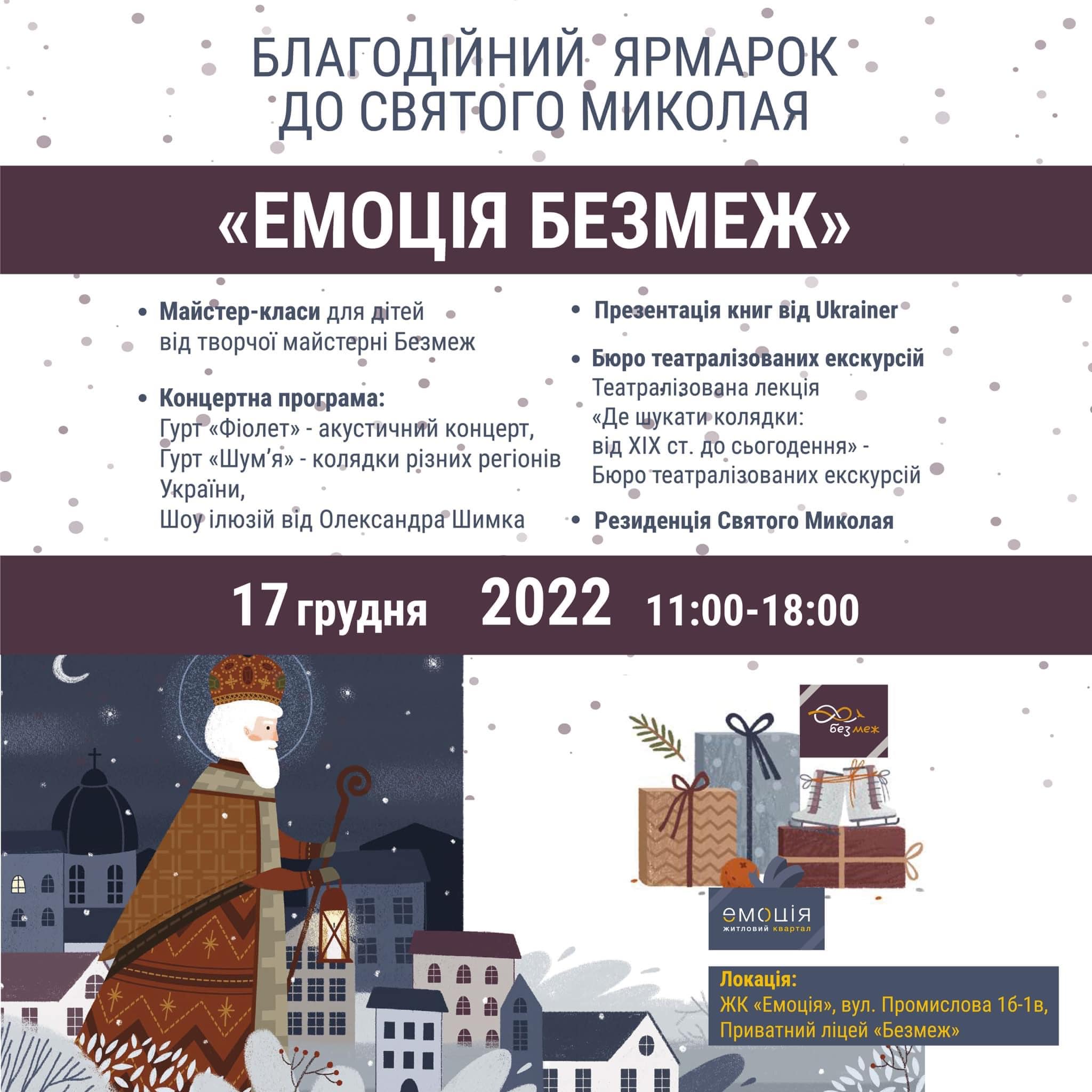 Запрошуємо на благодійний ярмарок до Дня святого Миколая! На вас очікують різноманітні майстер-класи, стенди з генд-мейд продукцією від майстрів, запашні напої та смаколики, інтерактивні лекції, концертно-мистецька програма. Ярмарок складатиметься з безмежно яскравих локацій: Резиденція святого Миколая(13:00-15:00) Тут розпочнеться святковий квест …